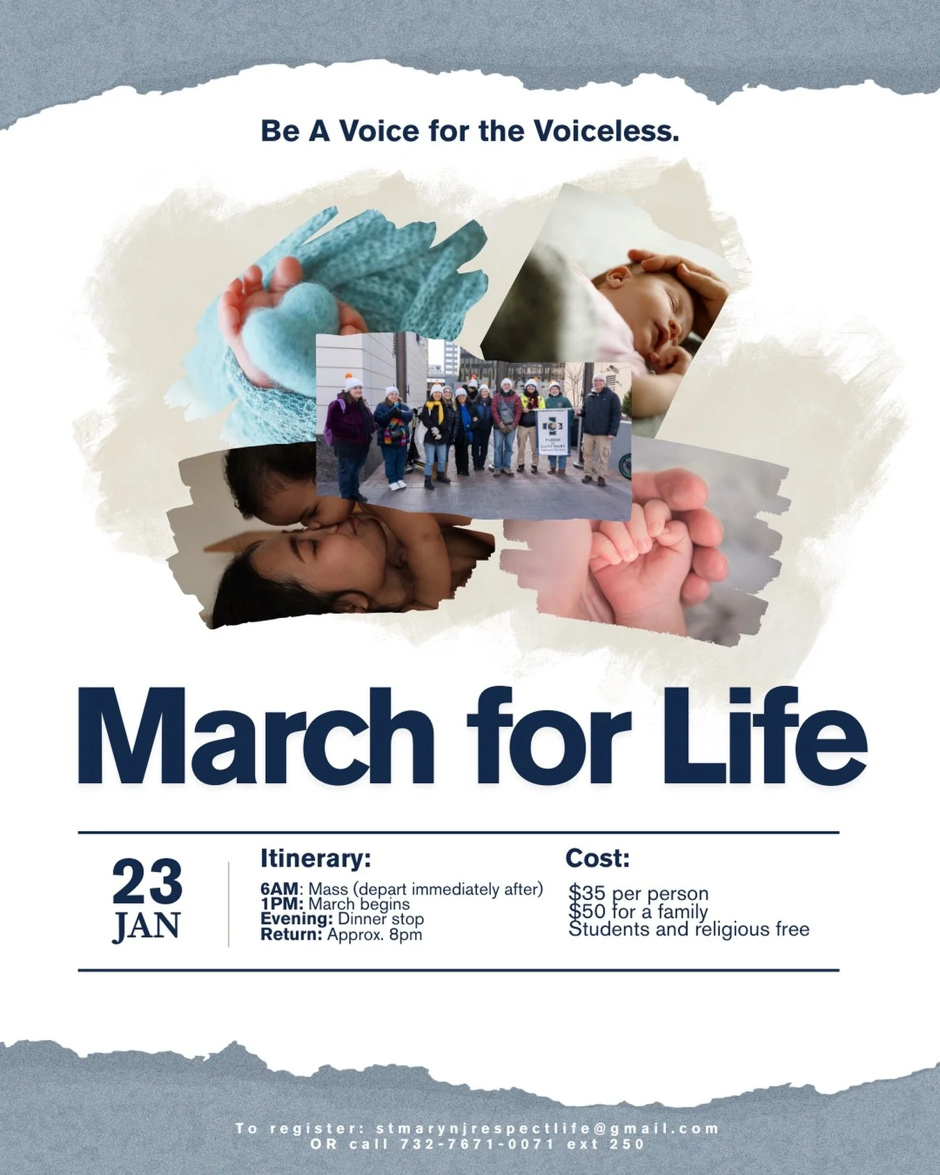 Join Saint Maryβs Respect Life Ministry on Friday, January 23, 2026, as we travel together to Washington, D.C. for the March for Life. The day begins with 6:00 AM Mass at Mary Mother of God Church, followed by departure by charter bus. Cost is $35 per person or $50 per family; students and religious attend free. Space is limited and available on a first-come, first-served basis. To reserve your seat email us!